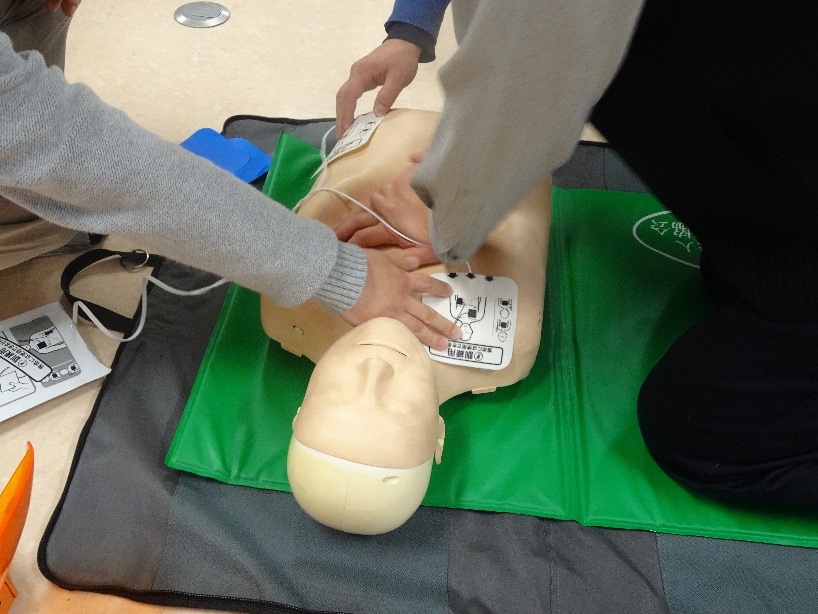 まず初めに一連の流れをデモンストレーションしていただいた後グループに分かれ、呼吸確認、119番通報者の選出、AED操作の依頼といった実際のシチュエーションに近い環境下で行いました。